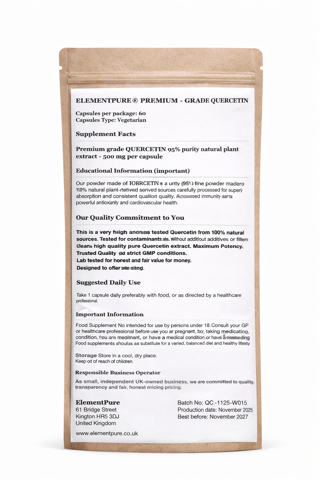 Our Quercetin Dehydrate Extract is 95% pure and sourced from natural plant-based ingredients. We focus on delivering a high quality extract that meets strict UK manufacturing standards. Extracts are stronger and more effective then raw powders. Our premium grade quercetin provide a clean and concentrated source of quercetin in it’s natural dihydrate form at an affordable price.